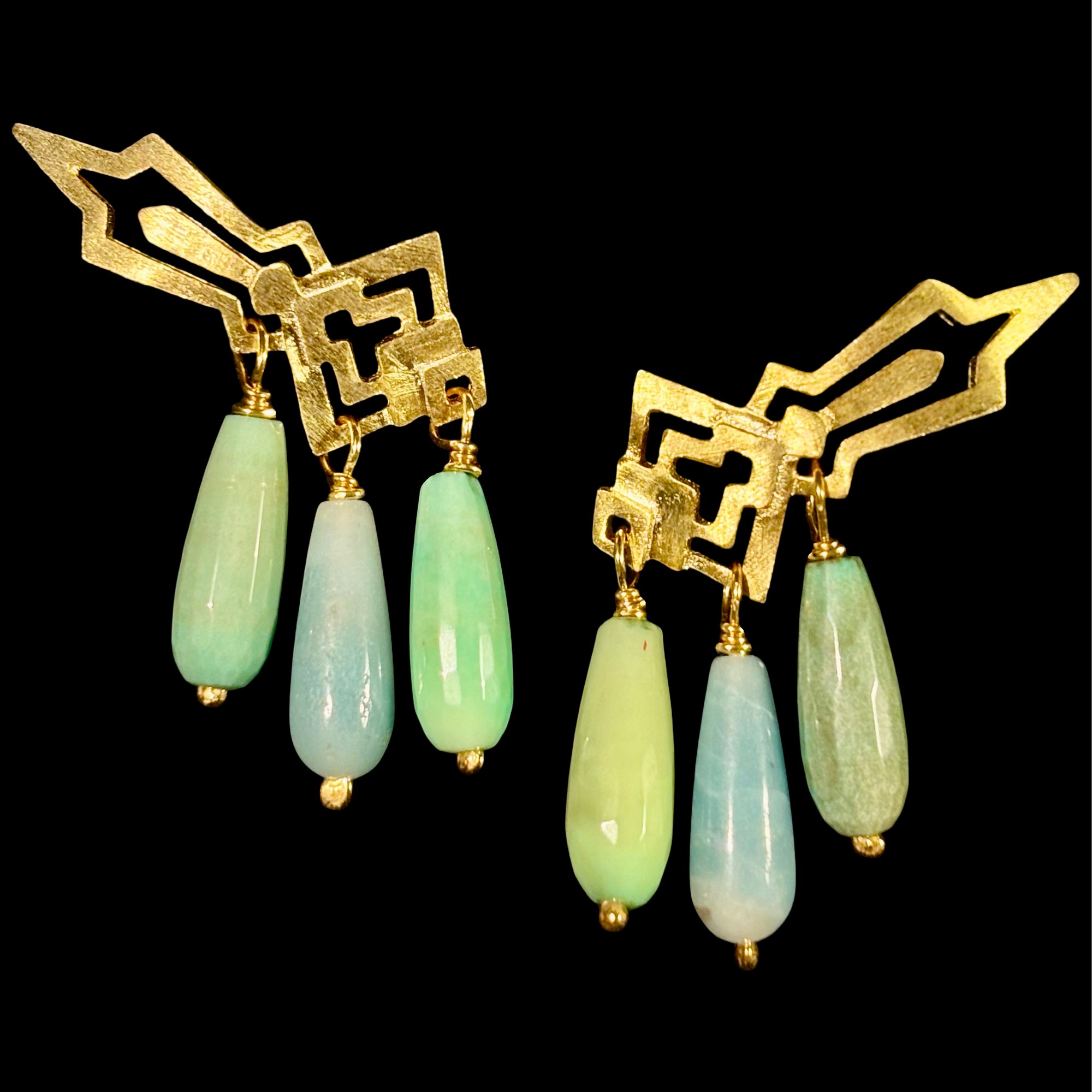Aztecah earring in Gold - rounded/curved pendant combined with 3 attached Grass Agate Drop Stone Pendants.